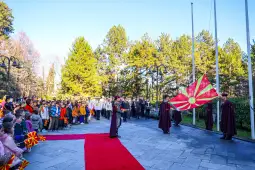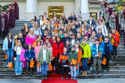 Скопје, 12 декември 2025 (МИА) - Во претседателскиот кабинет, денеска, 270 деца од скопските основни училишта „Вера Јоциќ“, „Лазо Ангеловски“ и „Димитар Македонски“, како и од градинките  „Буба Мара“ и „ЛИЛИПУТ ДВОРЧЕ“, присуствуваа на церемонијата на свечено менување на државното знаме. Учениците гордо и громогласно ја пееја химната, интонирана од македонскиот воен оркестар, овојпат придружуван од воениот оркестар на Вооружените сили на Романија, којшто престојува во земјава по повод заедничкиот предновогодишен концерт, информираат од Кабинетот на Претседателката Гордана Сиљановска Давкова.