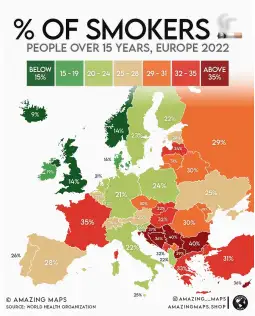 - Evropa është rajon me shkallln më të ëartë të pirjes së duhanit, ku mesatarisht 25,9 për qind nga popullata e rritur mbi 15 vjet përdor produkte të duhanit, tregojnë të dhënat e platformës "Briliant Maps" (Brilliant Maps) në bazë të raportit global të Organizatës Botërore të Shëndetësisë (OBSH) për trendet në përdorimin e duhanit dhe nikotinit nga viti 2000 deri në vitin 2022, me pojeksione deri në vitin 2030.