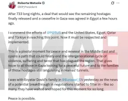 "Tani duhet të respektohet dhe të zbatohet. Ky është një moment vendimtar për paqen dhe rindërtimin në Lindjen e Mesme dhe hap një rrugë që mund të thyejë më në fund ciklin ndërgjeneracional të dhunës, vuajtjeve dhe terrorit që ka pllakosur rajonin. U jep shpresë të gjithë atyre në Gaza që kërkojnë një të ardhme paqësore dhe familjeve të pengjeve që ende enden nëpër tunelet e Hamasit", theksoi ajo. sa/