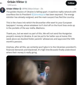 "Është zbuluar rrjeti i mafias ushtarake me lidhje të panumërta me presidentin (e Ukrainës) Volodimir Zelenski. Ministri i Energjetikës tashmë ka dhënë dorëheqjen dhe i dyshuari kryesor është larguar nga vendi. Ky është një kaos në të cilin elita e Brukselit dëshiron të injektojë para te taksapaguesit evropianë, ku gjithçka që nuk është qëlluar në front përfundon në xhepat e mafias ushtarake. Çmenduri", shkroi Orban në rrjetin X.