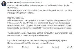 Marrëveshja e BE-së nuk lë vend për paqartësi: shtetet anëtare vendosin unanimisht për anëtarësimin. Populli hungarez ka vendosur. Në referendum ata me shumicë dërrmuese i thanë "jo" anëtarësimit të Ukrainës në BE. Nëse doni ta ndryshoni këtë, fushata juaj mediatike kundër Hungarisë ndoshta nuk është mënyra më e mirë për të përfituar miq”, shkroi Orbani në X.