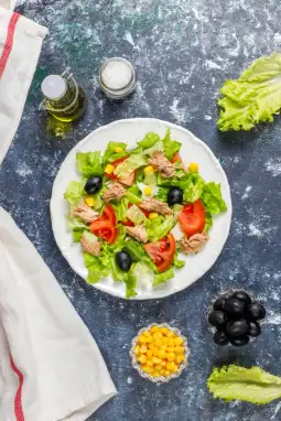 Nëse jeni duke kërkuar një vakt të lehtë dhe të shëndetshëm që do t'ua freskojë ditën - kjo sallatë me ton është zgjedhja e duhur! Kombinimi i sallatës së freskët, domates së lëngshme, kastravecit, ullinjve dhe tonit është një përzgjedhje e vërtetë - kurse misri i butë i jep asaj një shije të ëmbël që do t'ju shijojë që në kafshatën e parë.