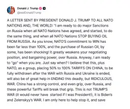 - Presidenti amerikan Donald Trampi, sot përmes rrjetit të tij social "Truth Social" u dërgoi një letër të gjitha vendeve të NATO-s dhe botës, në të cilën potencon se është i gatshëm të vendosë sanksione ndaj Rusisë kur të gjitha vendet e NATO-s të ndalojnë së bleri naftë nga Rusia.