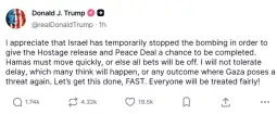 "Hamasi duhet të veprojë shpejt, ose të gjitha bastet do të bëhen të pavlefshme", njoftoi Tramp sot në platformën e tij Truth Social.