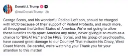 "Nuk do t'i lejojmë më këta të çmendur ta shkatërrojnë Amerikën, për të mos i dhënë kurrë një shans të "MARRË FRYMË" dhe të jetë e LIRË. Sorosi dhe banda e tij e psikopatëve i kanë shkaktuar dëme të mëdha vendit tonë! Kjo përfshin edhe miqtë e tij të çmendur nga Bregu Perëndimor. Kini kujdes, po ju vëzhgojmë! Faleminderit për vëmendjen tuaj ndaj kësaj çështjeje!, ndau Tramp. ls/