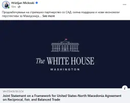 On his Facebook profile, he noted that after signing the partnership agreement with the United Kingdom and closing the 26-year post-monitoring dialogue with the Council of Europe, the White House issued late last night a joint statement between the United States and Macedonia on reciprocal trade.