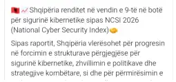 - Shqipëria është renditur në vendin e 9-të në botë për sigurinë kibernetike sipas NCSI 2026 (Indeksi kombëtar i sigurisë kibernetike).