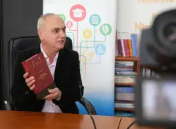 Скопје, 20 февруари 2026 (МИА) - Проф. Гоце Цветановски, научен советник  во Институтот за македонски јазик „Крсте Мисирков“ - Скопје, кој по три години работа, го подготви првиот том од Макеоднскиот етимолошки речник (А - Ж), прв во државата, денеска ѝ врачи примерок од изданието на министерката Весна Јаневска во знак на благодарност за поддршката од Министерството за образование и наука во реализацијата на проектот.