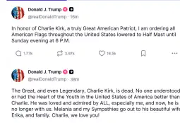 - -Големиот, па дури и легендарниот Чарли Кирк, е мртов. Никој не го разбираше или го немаше срцето на младите во Соединетите Американски Држави подобро од Чарли. Тој беше сакан и почитуван од сите, особено од мене, а сега, тој повеќе не е со нас, објави претседателот на САД, Доналд Трамп
