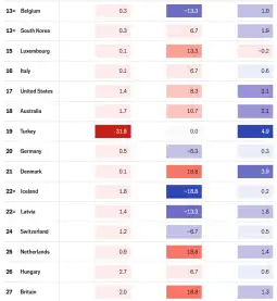 Всушност, нашиот прв показател е базичната инфлација (core inflation), која ги исклучува цените на храната и енергијата бидејќи тие се нестабилни. Една земја постигнува подобар резултат на нашето рангирање колку што нејзината годишна стапка е поблиску до 2%, што е типична цел за централните банкари. Инфлацијата во Турција е сѐ уште милји надвор од она што се среќава насекаде на друго место, поради лудата економска политика на нејзиниот претседател, Реџеп Тајип Ердоган. Естонија е втора најлоша, со основна инфлација од речиси 7% во третиот квартал на 2025 година, бидејќи сѐ уште се опоравува од огромниот енергетски шок од 2022 година. Многу други земји имаат свои сопствени потешкотии. Основната стапка на инфлација во Британија е пониска отколку што беше во овој период лани. Но, со 4%, таа е сѐ уште далеку над нивото каде што би сакала да биде Банката на Англија.