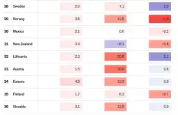 Што е со растот и работните места — другите работи за кои гласачите длабоко се грижат? Тука, Португалија се истакнува. Туризмот доживеа бум, додека многу богати странци се преселуваат во земјата за да ги искористат ниските даночни стапки. Растот на БДП е далеку над европскиот просек. Чешката Република и Колумбија бележат пристојни зголемувања и на производството и на вработеноста, туркајќи ги во горната третина од нашето рангирање. Наспроти тоа, Јужна Кореја губи работни места. Норвешка, која е во голема мера изложена на суровини и бродски превоз, се бореше со забавувањето на глобалната трговија.