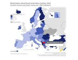 - Во 2024 година, во ЕУ имало 737 142 автобуси и моторни автобуси (вклучувајќи тролејбуси, минибуси и минибуси), т.е. 1,6 автобуси и моторни автобуси на 1000 жители. Северна Македонија со 3 690 автобуси или по два автобуса на 1 000 жители е нешто над европскиот просек.