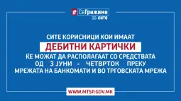 Од МТСП информираат дека корисниците на парични права коишто поседуваат дебитна картичка ќе можат да подигнат готовина на банкоматите на банките, да ги користат средствата за безготовински плаќања во продажната мрежа или преку електронско и мобилно банкарство од денеска – 3 јуни 2021 година.