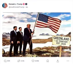 На друга фотографија, споделена денеска, Трамп е прикажан како поставува американско знаме на Гренланд, заедно со потпретседателот Џеј Ди Венс и државниот секретар Марко Рубио. На натписот стои: „Гренланд - територија на САД, основана 2026“.