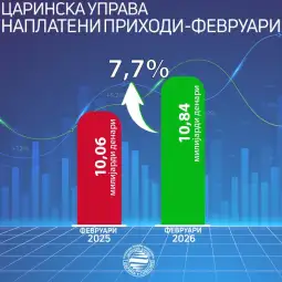 Скопје, 2 март 2026 (МИА) - За 778,3 милиони денари или 7,7 отсто е зголемена наплатата на приходи во февруари, период во кој Царинската управа наплати вкупно 10,8 милијарди денари, соопштија од Царинската управа.