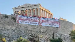 - Со пораките „Да се запре геноцидот“, „Да не постои никаква соработка со државата – убиец Израел“ и „Слобода за Палестина“, напишани на грчки и англиски јазик, членови на Комунистичката партија на Грција (ККЕ) и на подмладокот на партијата (КНЕ), рано утрово поставија гигантски паноа на Акропол, јави дописничката на МИА од Атина.