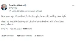 „Пред една година, претседателот Путин мислеше дека брзо ќе го освои Киев. А потоа ја запозна храброста на Украинците и железната волја на народите ширум светот“, се наведува во објавата на официјалниот Твитер профил на американскиот претседател. ссм/