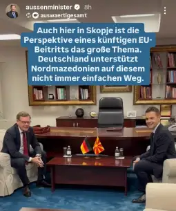 Скопје, 19 ноември 2025 (МИА) – „Тука во Скопје перспективите на идното пристапување во ЕУ се голема тема. Германија ја поддржува Македонија на овој пат, којшто не е секогаш е лесен“. Ова во стори на својот Инстаграм профил го објави шефот на германската дипломатија Јохан Вадефул, по средбата синоќа во Скопје со својот македонски колега Тимчо Муцунски.