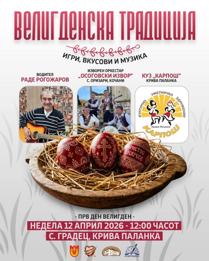 - Во организација на Општина Крива Паланка и институциите од областа на културата од општината, денес со радост и празнична енергија ќе се реализација традиционалната манифестација "Велигденска традиција 2026" во културно-историскиот локалитет во село Градец.