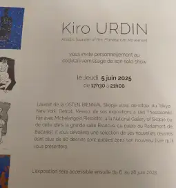 - Загрижен за потемната страна на човекот и растечката неповрзаност со природата, визуелното истражување на Киро Урдин е фокусирано на поетскиот позитивизам, присилно ја деконтекстуализира претстават за просторот и времето, потпирајќи се на бојата како психолошки уред за директно активирање на емоцијата и духовноста. Изградена врз слоеви од масло, основата на неговите композиции со големи димензии прво ја истражуваат човечката ирационалност и ранливост на вознемирувачки гестурален манир. Во втората фаза, уметникот се стреми да ја врати контролата врз овој визуелен хаос, негувајќи ја сликата со геометриски и хроматски полиња кои генерираат нова рамнотежа, свежа основа за нов живот. Крајната иконографија функционира како осмотски дијалог помеѓу хаосот и рамнотежата, се додава во најавата.