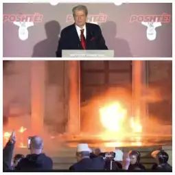 Во текот на неговиот говор учесниците во протестот почнаа на фрлаат молотови коктели и пиротехнички средства кон владиниот објект, поради што мораше да интервенира и противпожарно возило.