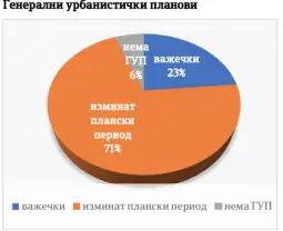 Постапката за донесување на урбанистички планови се врши преку електронски систем е-урбанизам, но, посочуваат ревизорите, поради комплексноста, обезбедувањето на мислења од 22-30 институции / установи и правни лица, должината на законски утврдените рокови и нивното недоследно почитување, од вкупно 34 општини со седиште во град, 8 општини (23 проценти) имаат важечки ГУП, 24 општини (71 процент) имаат ГУП со изминат плански период, а две општини (6 проценти) воопшто немаат донесено генерален урбанистички план. Генералните урбанистички планови на 14 општини се донесени по изминување на 3 до 5 години од планскиот период за кој се однесуваат, со што градовите не се во можност да ги разработат со детални планови за времетраење на периодот.