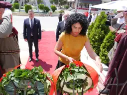 Заменик-министерот Ристески дел од владината делегација на чествувањето на загинатите бранители пред комплексот „Карпалак“ во Прилеп
