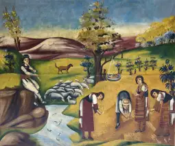-Овие мотиви не се случајни, туку резултат на културниот и интелектуалниот контекст во кој се формира македонската модерна уметност во првата половина на дваесеттиот век, период во кој традицијата и фолклорот се препознаваат како клучни носители на културната меморија. Уметниците како Лазар Личеноски, Никола Мартиноски, Димитар Пандилов и Вангел Коџоман, како дел од првата генерација академски образувани македонски сликари, создаваат специфичен визуелен јазик, во кој локалната култура се претвора во уметнички израз. Нивните композиции со селски пејзажи, сцени од жетва, бачила, пазарни сцени и портрети на луѓе од различни етнички заедници не се само естетски интерпретации, туку и вредни визуелни сведоштва за традиционалниот начин на живот, наведува Националната галерија.