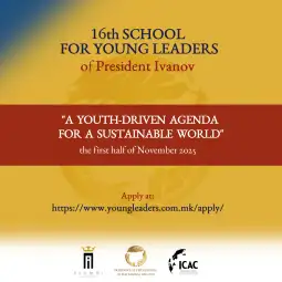 - „Младинска агенда за одржлив свет“ е темата на 16. Меѓународна обука за млади лидери на поранешниот претседател на државата Ѓорге Иванов, која ќе се одржи во првата половина на ноември годинава. Кабинетот на Иванов соопшти дека денеска е објавен конкурсот за учесници на Школата, рокот за аплицирање е до 30 јуни 2025.