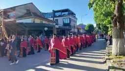 Струга, 7 мај 2025 (МИА) - На раскошно украсен епитаф, моштите на Свети Георгиј Победоносец, неговата чудотворна икона и иконата на Мајката Божја „Гликофилуса“ и годинава носени во торжествена литија ја осветија Струга.