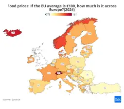 Цените на храната значително варираат низ цела Европа. Индексот на цените на храната на Евростат обезбедува добра основа за споредба. Ако просечната кошничка за храна во ЕУ е поставена на 100 евра, индексот покажува колку би чинела истата кошничка во секоја поединечна земја, наведува Еуроњуз. Ниво на цени над 100 значи дека земјата е поскапа од европскиот просек, додека вредност под 100 означува пониски цени.