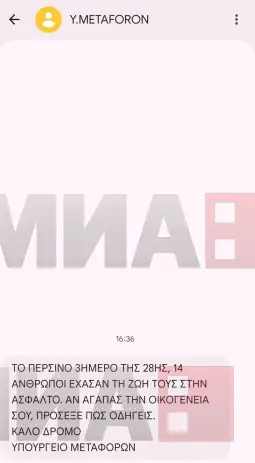 - За време на ланскиот продолжен викенд за 28 октомври, 14 луѓе ги загубија своите животи на патиштата. Ако го сакаш твоето семејство, внимавај како возиш.Среќен пат. Министерство за транспорт, е пораката што ја добија граѓаните во Грција, без разлика дали се возачи или не.