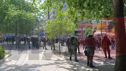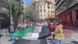 На протестите, освен слогани и плакати поврзани со работничките права и Денот на трудот, имаше и за „Слобода на Палестина“ со палестински знамиња.