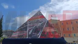 Пред грчкиот Парламент беа поставени рачно изработени големи пирамиди со колаж од фотографии од протести од изминатиот период.