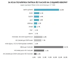 На прашањето за која политичка партија ќе гласате на следните избори, 24 отсто од испитаниците одговориле дека нивниот избор е ВМРО-ДПМНЕ. Втора партија е Вреди со 5,1 отсто доверба, па СДСМ о 4,9%, ДУИ 4,8%, Левица 3,1%, ЗНАМ 2,1… 28,1 отсто од испитаниците одговорија дека нема да гласаат, а 9,7% – „не знам дали ќе гласам“.
