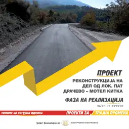 - Реконструиран е дел од локалниот пат Драчево – мотел „Китка“. Со вкупна должина од 6,42 километри и ширина на коловозот од 3,5 метри, патот доби стабилна, функционална и долготрајна сообраќајна инфраструктура, објави денеска на социјалните мрежи премиерот Христијан Мицкоски, во делот „Проекти за трајна промена - темели за сигурна иднина“.