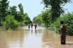 Британските медиуми пренесуваат дека жители на селото Кадирабад денеска газеа низ вода длабока до гради откако реката Ченаб се излеа од својот брег и предизвика ненадејни поплави.