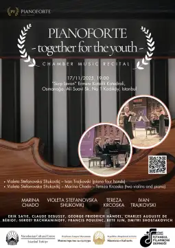Скопје, 17 ноември 2025 (МИА) - Камерно-музички рецитал „Пијанофорте - заедно за младите“ вечер ќе се одржи во „Сурп Левон“ - Ерменската католичка катедрала во Истанбул. Организатори се Македонскиот културен центар во Истанбул во соработка со Асоцијацијата на истанбулската филхармонија и Музичкото училиште „Пијанофорте“ од Скопје.