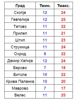 - Температурата денеска ќе се движи од 7 до 25 степени Целзиусови на територија на државата. Во Скопје, од 12 до 24 степени Целзиусови.