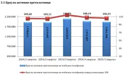 Скопје, 13 октомври 2025 (МИА) - Бројот на активни претплатници во мобилната телефонија во првиот квартал годинава изнесува 1.941.996 и е намален за 1,72 проценти во однос на последниот квартал лани, а зголемен од 0,62 проценти во