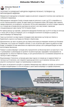 - Скопскиот и охридскиот аеродром лидери во регионот, потврдено и од меѓународните медиуми. Меѓународниот аеродром Скопје останува лидер во регионот со раст од 32 отсто споредбено со истиот период минатата година, објави на својот фејсбук профил, вицепремиерот и министер за транспорт Александар Николоски.