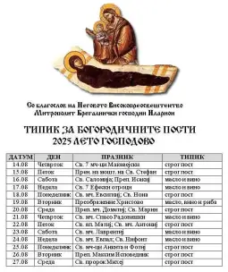 Скопје, 14 август 2025 (МИА) - За православните христијански верници денеска почнува двонеделниот Богородичен пост, кој е посветен на Успението на Пресвета Богородица. Овој пост е востановен во молитвено сеќавање на Пресвета Богородица, а со цел во периодот на неговото времетраење уште поинтензивно да се изискува молитвеното застапништво од Пресветата Богомајка.