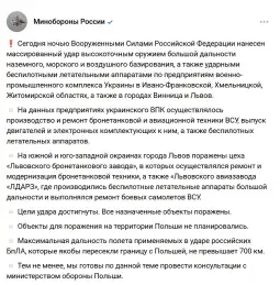 - Целите на нападот се остварени. Сите одредени цели беа погодени. Ниту една цел на територијата на Полска не беше планирана како мета, се наведува во соопштението на министерството.