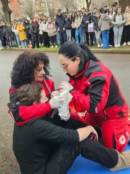 Велес, 25 декември 2025 (МИА) - Во дворот на гимназијата „Кочо Рацин“ во Велес денеска за велешките ученици од сите училишта од градот се одржи симулациска вежба во рамките на кампањата „Сигурни празници, без употреба на пиротехника“. Настанот го организираа Општинска организација на Црвен крст во соработка со Министерството за внатрешни работи, односно полициски службеници од СВР Велес, Отсекот за превенција и Полициската станица Велес и екипа на Брза помош при ЈЗУ Здравствен дом. Во рамки на вежбата беше прикажана симулација за укажување прва помош на лица повредени при употреба на пиротехнички средства.