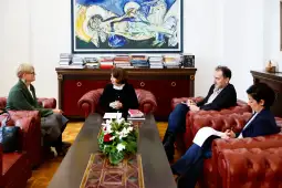 Скопје, 6 ноември 2025 (МИА) - Претседателката Гордана Сиљановска-Давкова денеска ја прими Ана Стојаноска, уметничка директорка на МТФ „Војдан Чернодрински“, театролог, писателка и редовна професорка на Драмскиот факултет во Скопје. Директорката детално ја запозна со програмата на 60. јубилејно издание на фестивалот којшто ќе се одржи во јуни следната година под провокативното мото „Храбриот нов театар“. Импресионирана од иновативноста на програмската содржина, претседателката со задоволство прифати да биде покровителка на фестивалот, информираат од кабинетот на Сиљановска давкова.