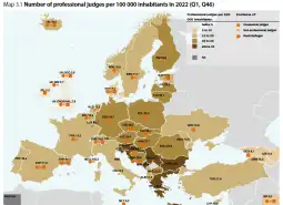 Но, има и земји со по над 40 судии на 100 000 жители. Според CEPEJ, овие нееднаквости можат да се објаснат, барем до одреден степен, со разновидноста на европските судски организации и правни системи, кои се производ на долги историски процеси. Така, малиот број на професионални судии по жител во Велика Британија - Англија и Велс, Велика Британија - Северна Ирска и Велика Британија - Шкотска може да се објасни со многу високиот процент на случаи што спаѓаат во надлежност на судовите на магистратите составени од непрофесионални судии. Картата ги прикажува сите земји што имаат и повремени професионални судии, како и непрофесионални судии кај некои земји.