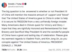 Изјавата на Трамп доаѓа во момент кога Си Џинпинг, пред 26 светски лидери, вклучувајќи ги Путин и Ким, зборуваше за „незапирливата“ Кина, која „никогаш нема да дозволи да биде заплашена од насилници“.