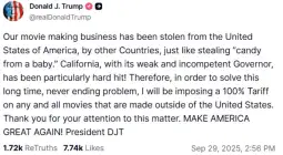 „Нашата филмска индустрија е киднапирана од други земји, исто како што крадат слатки од децата. Калифорнија, со својот слаб и некомпетентен гувернер, е особено силно погодена! Затоа, за да го решам овој долгогодишен и бесконечен проблем, ќе воведам 100-процентна царина за сите филмови направени надвор од САД. Ви благодарам за вашето внимание. Да ја направиме Америка повторно голема ! Претседател ДЈТ'“, објави Трамп на својата социјална мрежа.