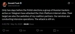 Варшава, 16 мај 2025 (МИА) - Група руски хакери ги нападнаа веб-страниците на партијата Граѓанска платформа на полскиот премиер Доналд Туск, изјави тој денеска, додавајќи дека цел на напади биле и веб-страниците на Новата левица и централно-десничарската Полска селанска партија.