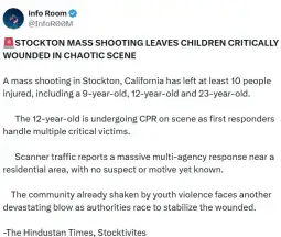 - Меѓу жртвите има деца и возрасни, потврди Хедер Брент, портпаролка на канцеларијата на шерифот на округот Сан Хоакин. Првичните информации „сугерираат дека ова можеби бил намерен инцидент“, рече Брент за време на прес-конференцијата на местото на настанот.